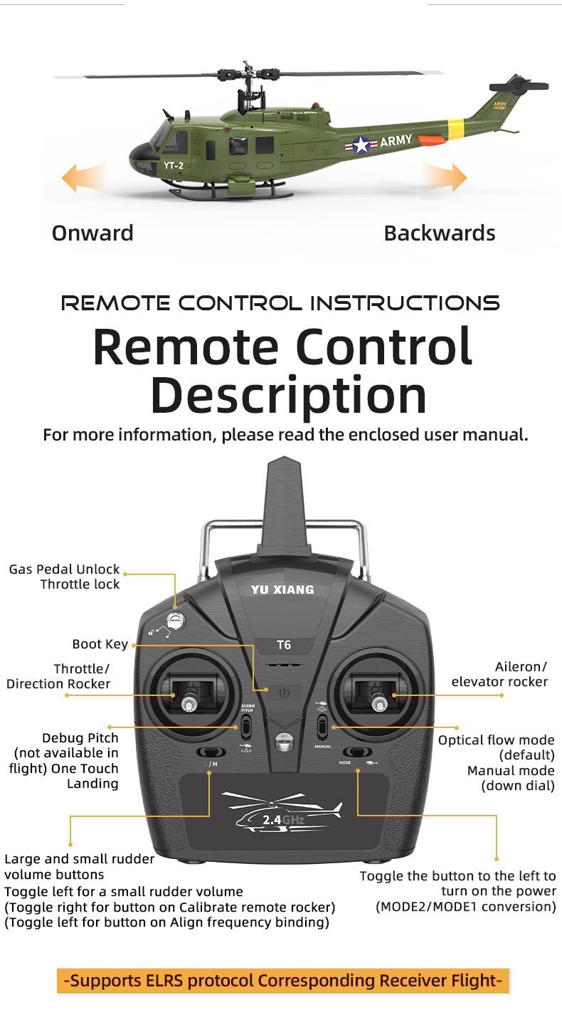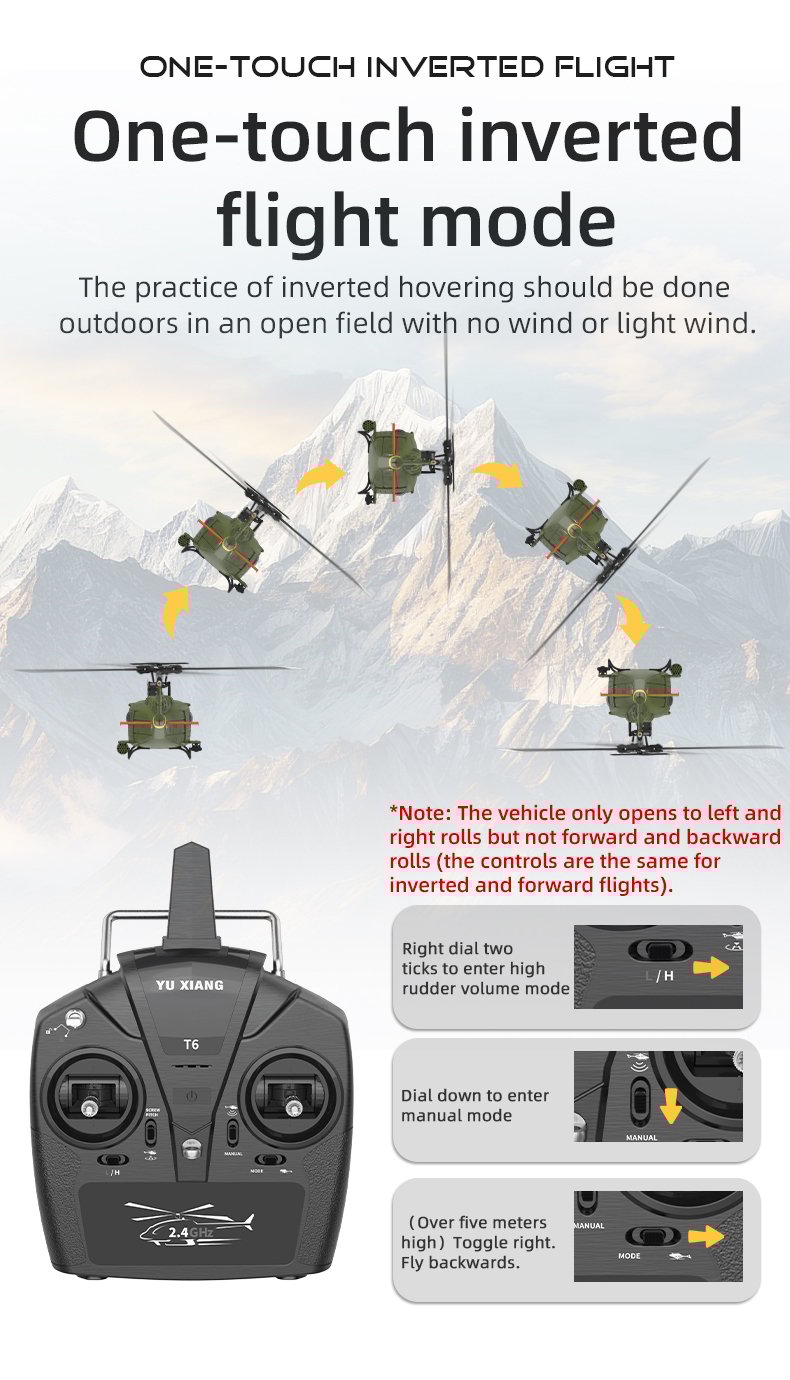 As a 6-channel RC helicopter, it supports a full range of flexible maneuvers, including vertical take-off/landing, altitude hold, forward/backward flight, left/right side flight, 360° horizontal rotation, and inverted flight (for experienced pilots). The precise control stick and adjustable sensitivity allow users to customize the control feel according to their skill level—beginners can set low sensitivity for stable flight, while seasoned pilots can increase sensitivity for cool aerobatic actions. It fully meets the needs of adult users from entry-level to advanced flight.